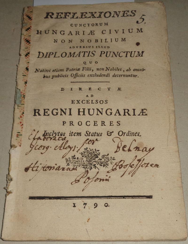 rare books put into the basket (1765-1809)], [Belnay György Alajos: REFLEXIONES CUNCTORUM HUNGARIAE CIVIUM NON NOBILIUM ADVERSUS ILLUD DIPLOMATIS PUNCTUM QUO NATIVI ETIAM PATRIAE FILII, NON NOBILES, AB OMNIBUS PUBLICIS OFFICIIS EXCLUDENDI DECERNUNTUR : DIRECTAE AD EXCELSOS REGNI HUNGARIAE PROCERES INCTYTOS ITEM STATUS & O.