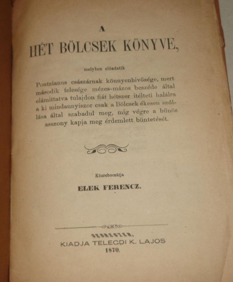Elek Ferencz: A hét bölcsek könyve. Melyben előadatik Pontzianus császárnak könnyenhívősége, mert második felesége... a bűnös asszony kapja meg érdemlett büntetését.