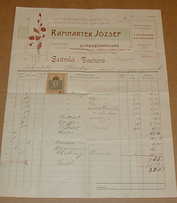 RAMHARTER JÓZSEF Vászonkereskedés. Pozsony.
