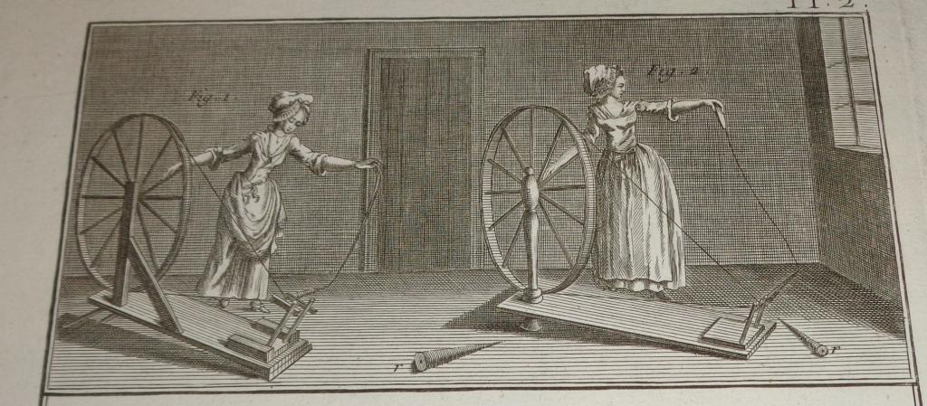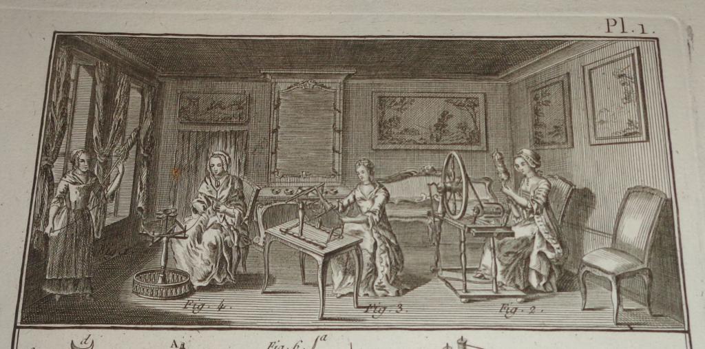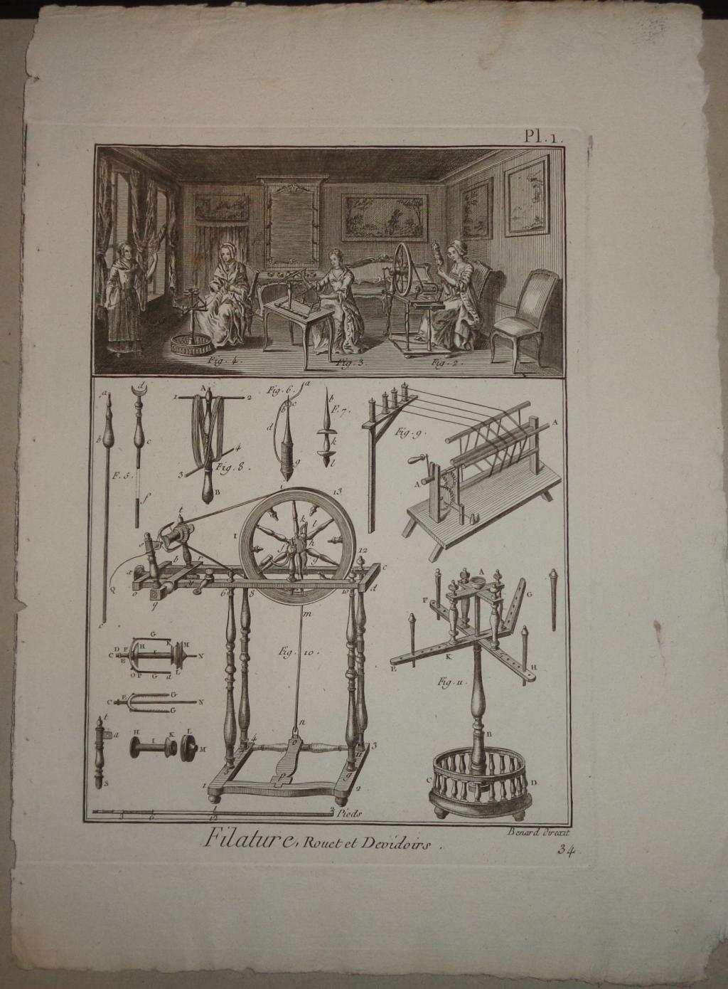 profession, industry history put into the basket Robert Bénard (1734–1777): Filature, Rouet et Devidoirs. I-V. (Fonás, rokka és motollák (fonalgombolyítók)-(Spinning).