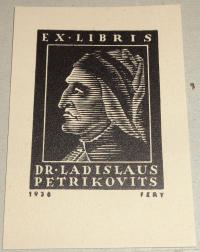 me6001. metszet/Ex libris, kisgrafika/magyar berak a kosárba Fery Antal: Ex libris Dr. Ladislaus Petrikovits.1939. .méret: 7x5 cm. lapméret: 9x7 cm. ár: 900 FORINTHátlapon felragasztás nyoma.