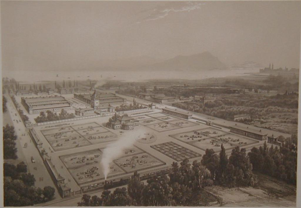 Loeillot: [Nagyvágóhíd] Oeffentliche Schlachthaus und Viehmarkt in Buda-Pest. 1, Vogelperspektive. 2, Haupt-Thor.