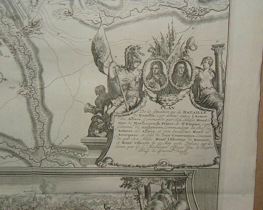 Here, in one of his most brilliant victories, Marlborough commanded British, Dutch, and Danish troops and defeated the French under Villeroi. Exceptional title cartouche with portraits and allegorical figures.