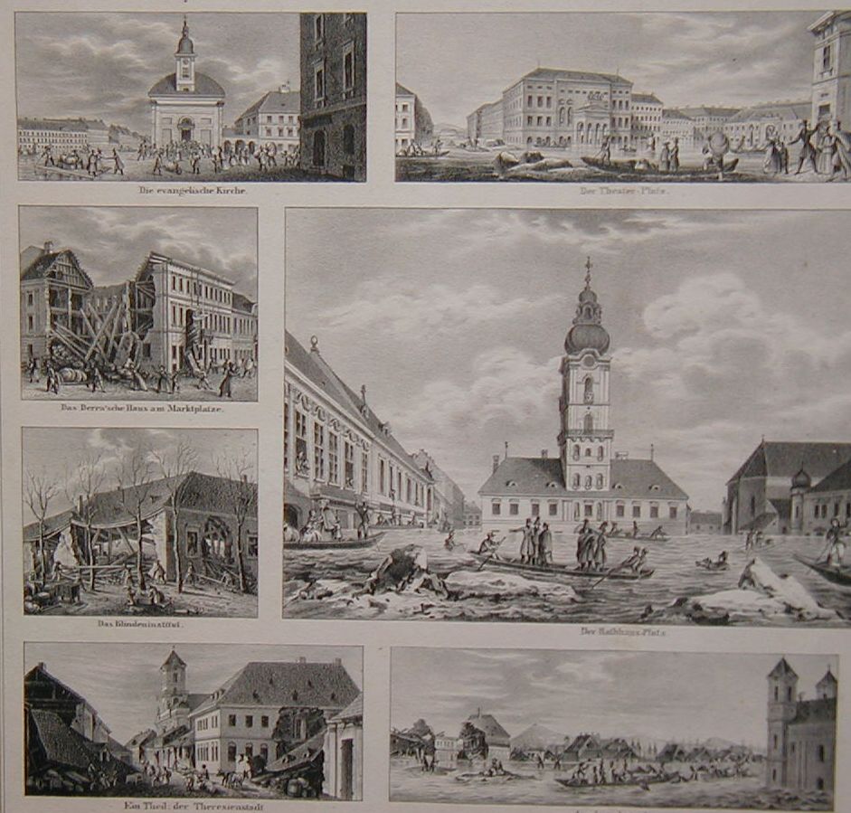 Ilyennek tekinthetjük a Trentsensky és társától Pesten nyomtatott és kiadott következő című "Pesth am 13 - 18 März 1838" rajzot, mely félíven, nagy median folió alakban készült; 11 kép volt rajta, melyet természet után Schwindt rajzolt s kőre edzett Torsch. Ára szép svájci velinpapiron l frt 30 kr. khinai velinen 2 frt. volt pengő pénzben. "E tábla - írja a pozsonyi Századunk 1838. évi május 14-iki 39-ik számában, 312. hasáb - honi művészetünk egyik figyelemre méltó terméke, szintannyi hűséggel mint művészi tökélylyel terjeszti élőnkbe a Dunaár pusztításait s nagyságát". E kép a következő helyeken tüntette föl az árvíz pusztítását: